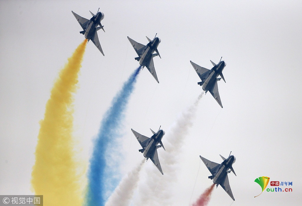 2018年11月8日,廣東珠海,第十二屆中國國際航展第三天??哲姟鞍艘弧憋w行表演隊(duì)的隊(duì)員們,發(fā)揚(yáng)連續(xù)作戰(zhàn)精神,給觀眾們表演了七機(jī)分組開花、四機(jī)編隊(duì)橫滾等高難動(dòng)作,受到觀眾們的稱贊。視覺中國