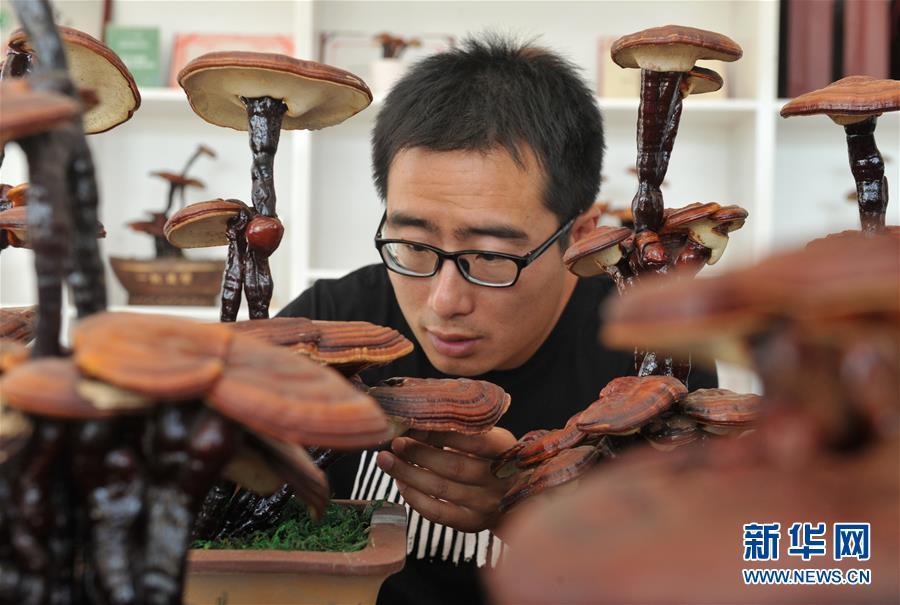 6月20日,廣宗縣大柏社村村民王志恒在展示制作的靈芝盆景。 近年來(lái),河北省廣宗縣大柏社村積極引導(dǎo)農(nóng)民結(jié)合市場(chǎng)需求調(diào)整農(nóng)業(yè)產(chǎn)業(yè)結(jié)構(gòu),采取“公司+合作社+基地+農(nóng)戶”的經(jīng)營(yíng)模式,發(fā)展特色靈芝種植,并開發(fā)出靈芝盆景、靈芝孢子粉等相關(guān)衍生產(chǎn)品,開辟出一條富農(nóng)創(chuàng)收新路徑。目前,大柏社村靈芝種植面積近百畝,種植各類靈芝5000余株,帶動(dòng)120余名農(nóng)民就業(yè)增收。新華社記者朱旭東攝