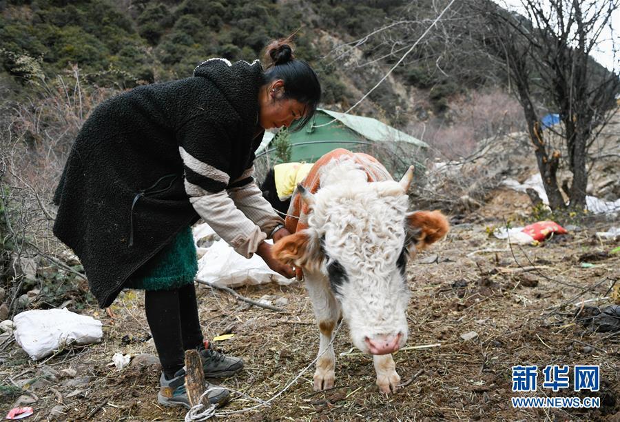 波羅鄉(xiāng)一臨時過渡安置點內(nèi)的群眾在放牛(10月14日攝)。 新華社記者 劉東君 攝