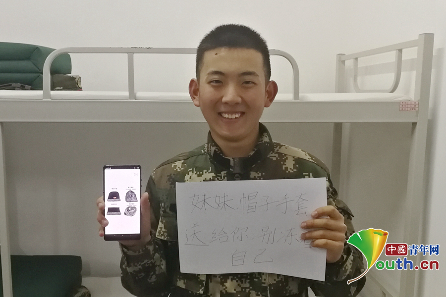 “俺們東北那旮瘩冬天特別冷,給妹妹買個(gè)防寒帽和棉手套,這樣上學(xué)就不會冷了?!蔽渚本┛傟?duì)執(zhí)勤第二支隊(duì)供圖。
