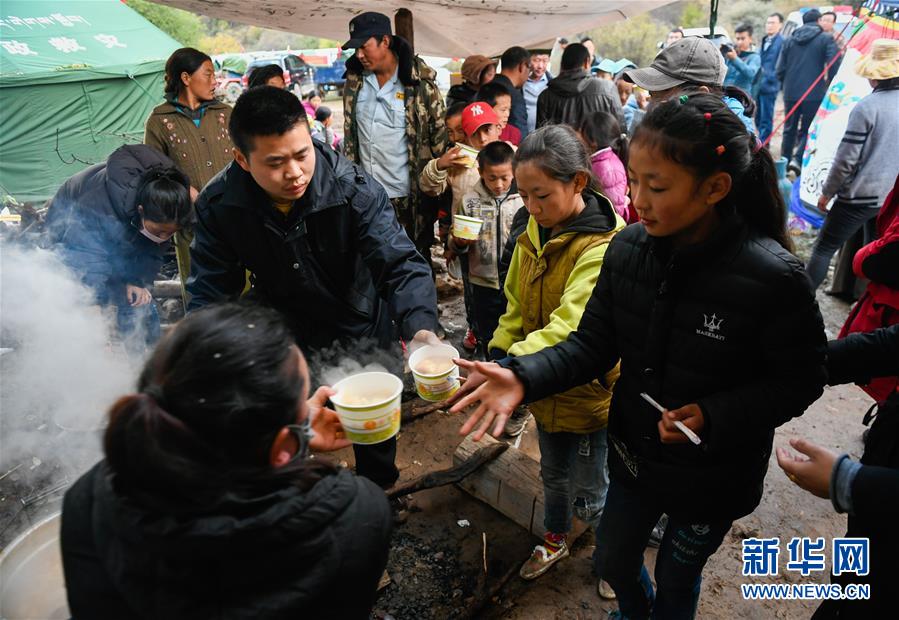 波羅鄉(xiāng)工作人員在熱多村安置點內(nèi)的“臨時做飯點”為波羅鄉(xiāng)第一小學(xué)學(xué)生盛晚飯(10月14日攝)。