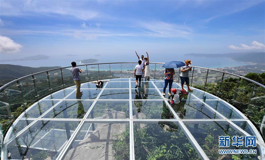 8月31日,游客在玻璃觀景平臺(tái)上參觀游覽。近日,位于海南省三亞市亞龍灣熱帶天堂森林公園的大佛石全海景玻璃棧道開始正式營業(yè)。凌空而建的玻璃棧道全長400米,游客可將亞龍灣的美景盡收眼底。新華社記者郭程攝