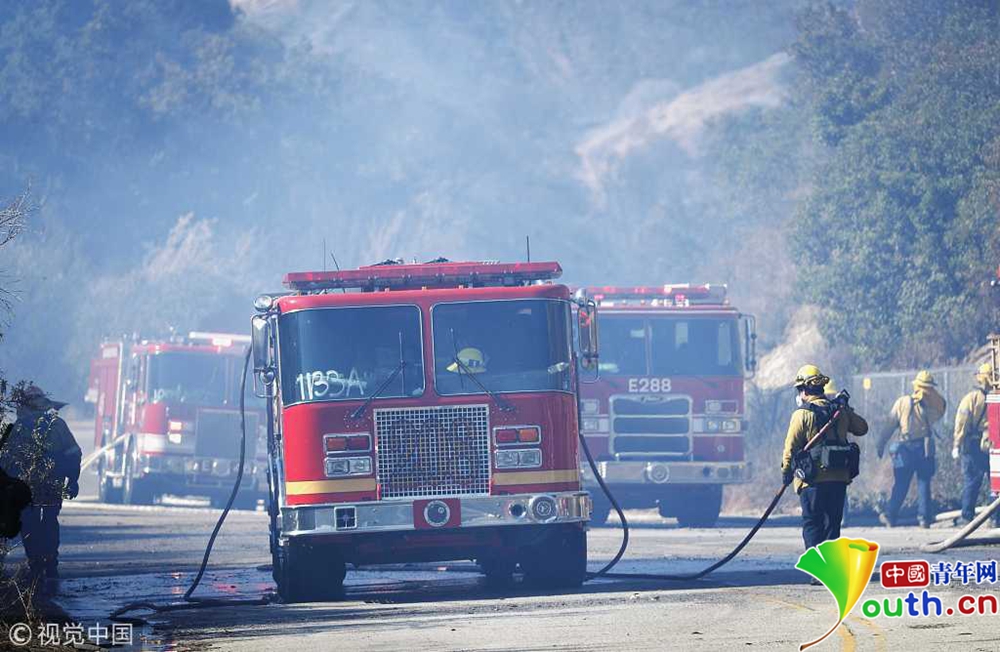 該郡第二大城市千橡樹市(Thousand Oaks)等很多地方房屋被毀,高速公路封閉,居民緊急疏散。洛杉磯郡圣蓋博市(San Gabriel)警察局警官日瓦戈(O. Zhivaga)和同事們當天清晨即受命馳援文圖拉郡,保護當?shù)鼐用窈拓敭a(chǎn)安全。圖為消防車行駛在已封閉的公路上,天空中濃煙滾滾。