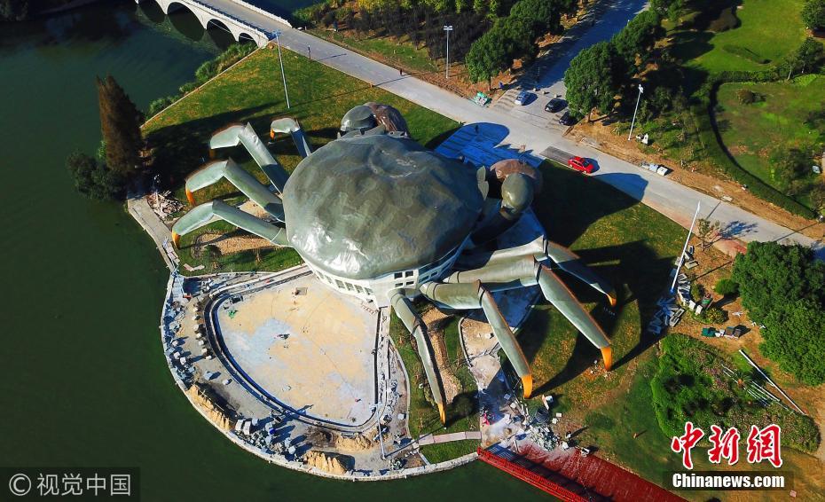 2017年10月31日,江蘇省昆山市巴城巴解園內(nèi)的東陽澄湖岸邊,一只青背白肚金爪黃毛,長(zhǎng)75米,高約16米的蘇州陽澄湖“超級(jí)大閘蟹”栩栩如生。圖片來源:視覺中國(guó)