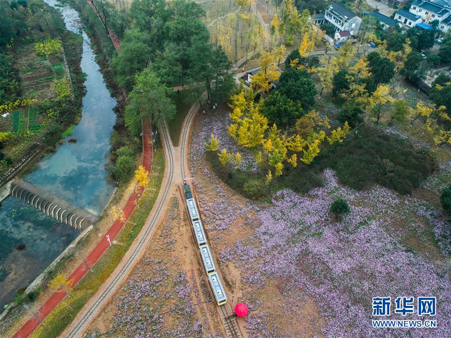 一列觀光小火車帶著游客穿行在銀杏林和花海之間(11月16日無人機(jī)拍攝)。近日,在浙江省長(zhǎng)興縣小浦鎮(zhèn),“十里銀杏長(zhǎng)廊”和近千畝花海經(jīng)過近一年的升級(jí)改造后,以嶄新的面貌與游客見面?;ê?、觀光小火車、古村民宿、銀杏長(zhǎng)廊等旅游項(xiàng)目全面提升了小浦鎮(zhèn)鄉(xiāng)村旅游的品質(zhì)。新華社記者 徐昱 攝