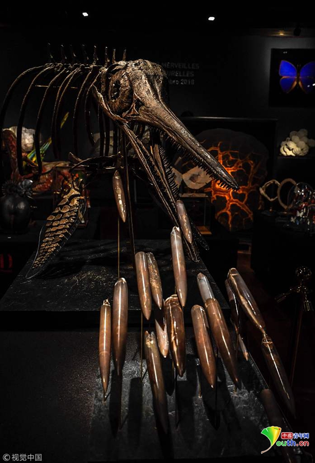 當(dāng)?shù)貢r間2018年11月19日,法國巴黎,在展出中的1.8億年前侏羅紀(jì)時期的恐龍骨架,將于11月20日在Drouot拍賣行拍賣。