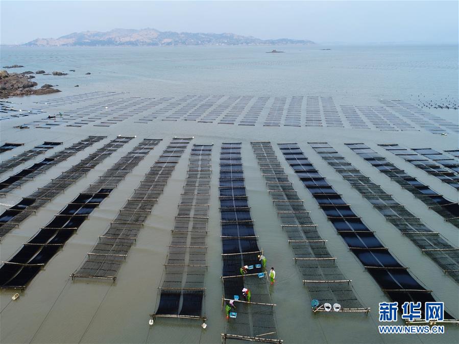 10月24日,福建莆田蔣山村村民在海上收割紫菜(無人機(jī)拍攝)?! ⌒氯A社記者姜克紅 攝
