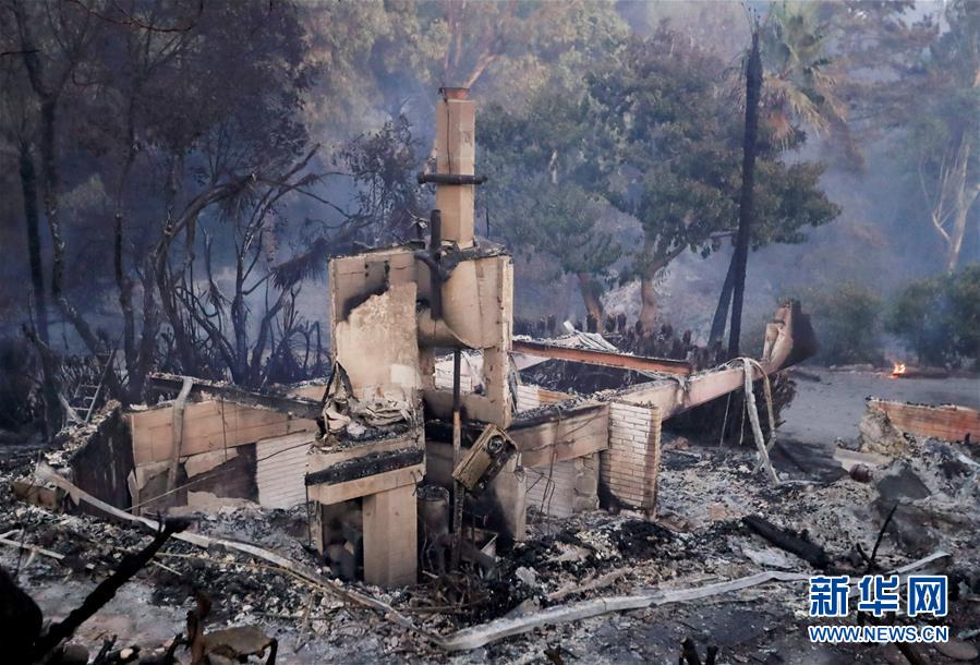 這是11月10日在美國(guó)加利福尼亞州馬里布市拍攝的一處被燒毀的廢墟。連日來(lái),美國(guó)加利福尼亞州野火肆虐。 新華社記者李穎攝