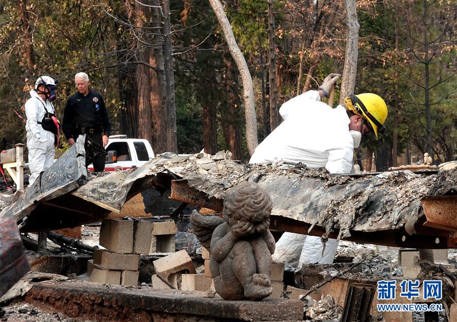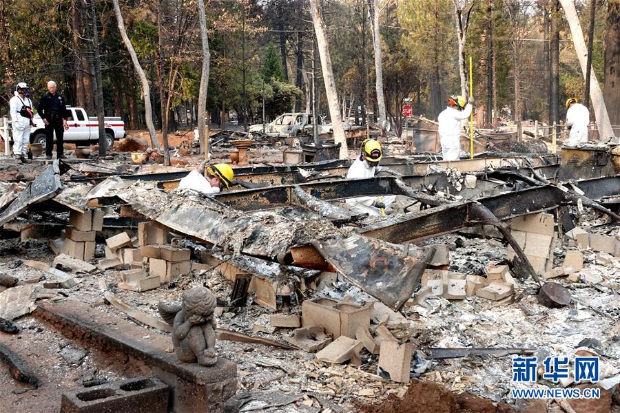 11月19日,在美國(guó)加利福尼亞州比尤特縣天堂鎮(zhèn),救援人員在山火廢墟中工作。新華社記者吳曉凌攝