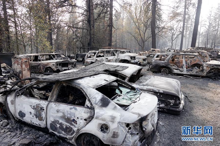 這是11月19日在美國(guó)加利福尼亞州比尤特縣天堂鎮(zhèn)拍攝的車(chē)輛殘骸和房屋廢墟。新華社記者吳曉凌攝