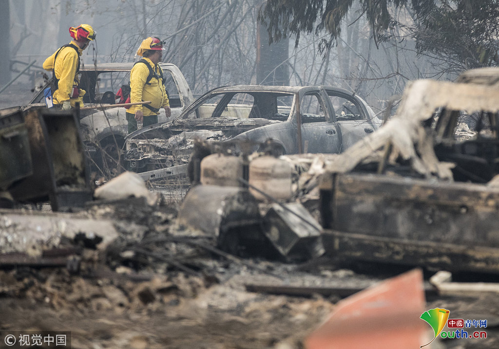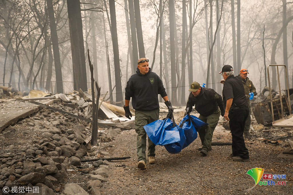 11月19日,在美國(guó)加利福尼亞州比尤特縣天堂鎮(zhèn),救援人員在山火廢墟中工作。