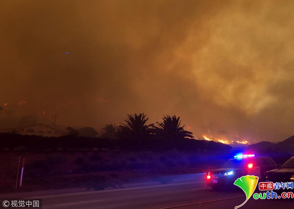 山火迅速蔓延至剛剛發(fā)生槍擊案的千橡樹(shù)市,并在9日翻過(guò)圣莫妮卡山,在強(qiáng)風(fēng)的助力下向海邊蔓延。