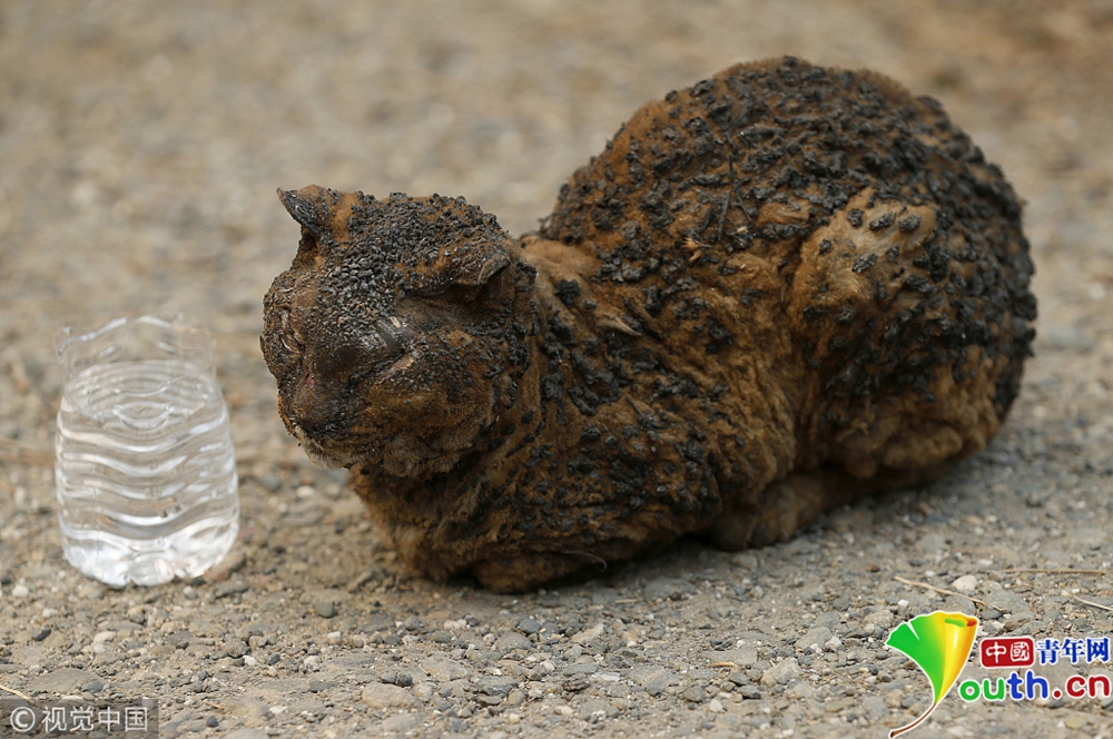 這場(chǎng)美國(guó)史上最嚴(yán)重山火導(dǎo)致7700多所房屋被毀,5萬(wàn)多人流離失所。一只被燒傷的貓?jiān)诘却齽?dòng)物管理局到來(lái)救助。