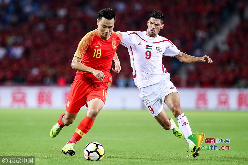 2018年11月20日,海口,2018國(guó)際足球友誼賽,中國(guó)男足Vs巴勒斯坦。郜林拼搶 圖片作者:null
