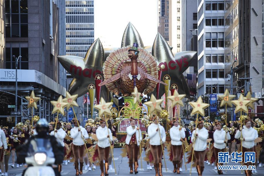 當(dāng)日,第92屆梅西感恩節(jié)大游行在紐約舉行,各式各樣的玩偶?xì)馇?、花車?duì)伍在曼哈頓的摩天大樓間穿行,吸引數(shù)百萬民眾前來觀看。梅西感恩節(jié)大游行始于1924年,是全美規(guī)模最大的感恩節(jié)游行。