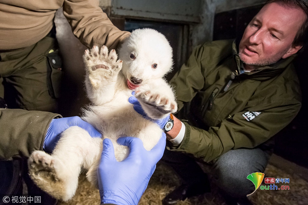 當(dāng)?shù)貢r(shí)間2017年1月12日,德國(guó)柏林,柏林蒂爾加滕動(dòng)物園為一只雄性北極熊寶寶檢查身體。熊寶寶于2016年11月3日出生,身高67厘米,體重4.6千克。