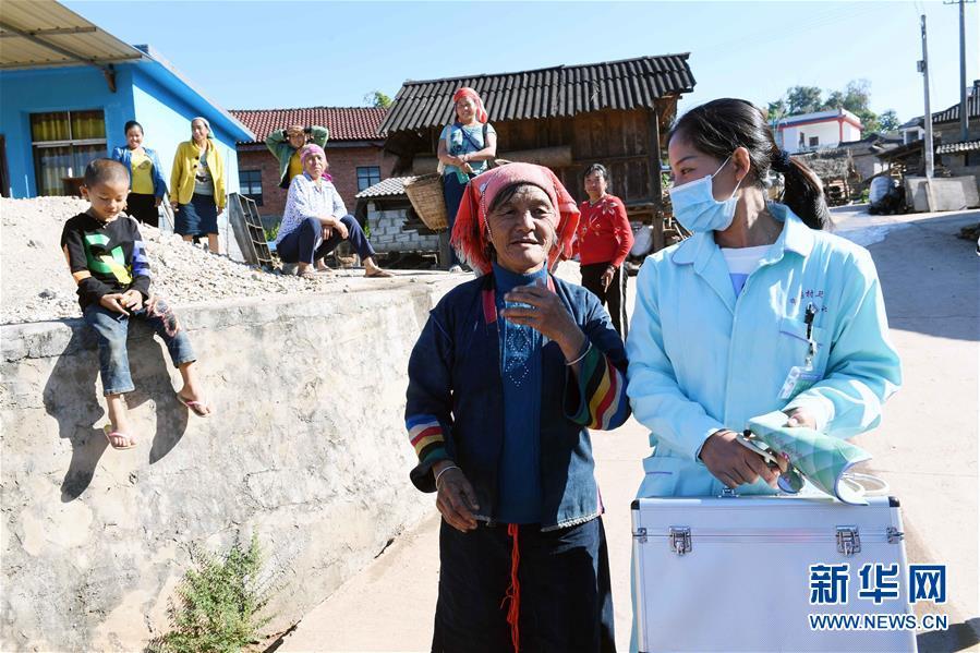 11月28日,張惠仙(右)在出診路上與村里的老人聊天。 新華社記者 楊宗友 攝