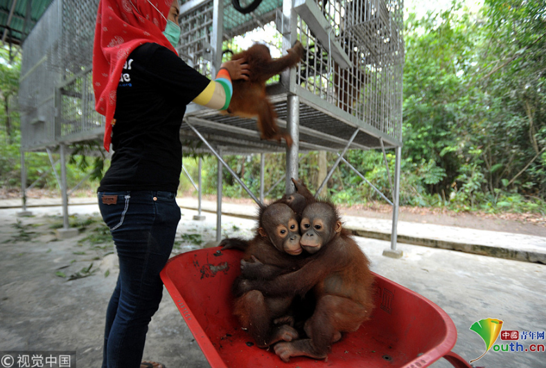 當(dāng)?shù)貢r間2018年9月18日,印尼加里曼丹克塔邦,國際動物救援(IAR)猩猩安全與保護中心里,飼養(yǎng)員用獨輪車把猩猩寶寶送到森林學(xué)校。圖片作者:Newscom