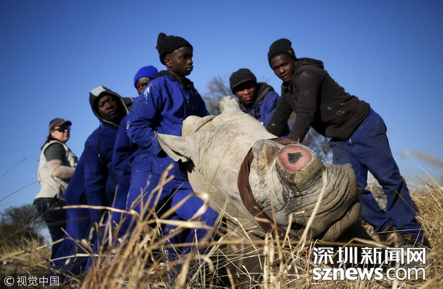當(dāng)?shù)貢r間2017年8月14日,南非西北省,一名工作人員在為一頭犀牛鋸角,這是一種保護犀牛的行為,可以防止它們喪命于偷獵者的槍口下。