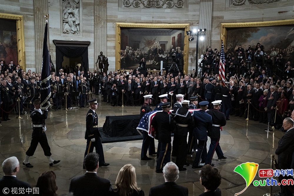 靈柩由一支軍事儀仗隊(duì)抬入圓形大廳,安置在1865年為林肯總統(tǒng)的棺材所建造的靈柩臺上。