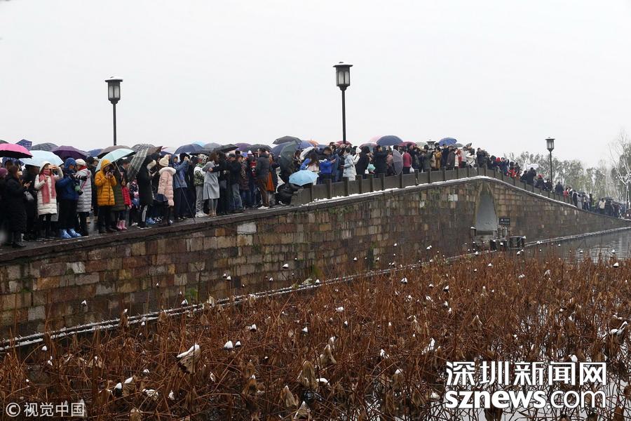 深圳新聞網(wǎng)訊 2018年12月8日,杭州,當(dāng)日市區(qū)普降大雪,市民和游客扎堆涌入西湖景區(qū),拍攝最美雪景照片以及為自己留影。每次杭州一下雪,斷橋便成為眾多游客欣賞雪景、拍攝雪景的地方,大家都想看看“斷橋殘雪”。游客們扎堆涌入斷橋后,人山人海,讓現(xiàn)場堪比春運(yùn)場景。因為人太多,雪積不起來,斷橋看不到殘雪。