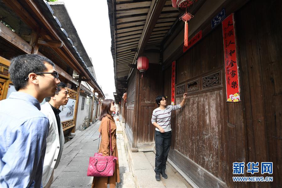 10月27日,琴江滿族村游客服務(wù)中心的鄭閩瓊(右一)向游客介紹三江口清朝水師旗營古兵房建筑特色。福州市長樂區(qū)琴江滿族村是福建省唯一的滿族聚居村,也是我國東南沿海保存較為完整的清代水師城堡。清雍正六年(1728年)時,清政府在此建立“福州三江口水師旗營”,鎮(zhèn)守閩江口,拱衛(wèi)省城,緝捕海盜,打擊走私。這里成為當(dāng)時全國四大水師旗營之一,隨后逐漸成為一個居民小鎮(zhèn)。有近300年歷史的琴江村既有軍事歷史背景,又有民族文化特色,2010年成為“中國歷史文化名村”。新華社記者 林善傳 攝