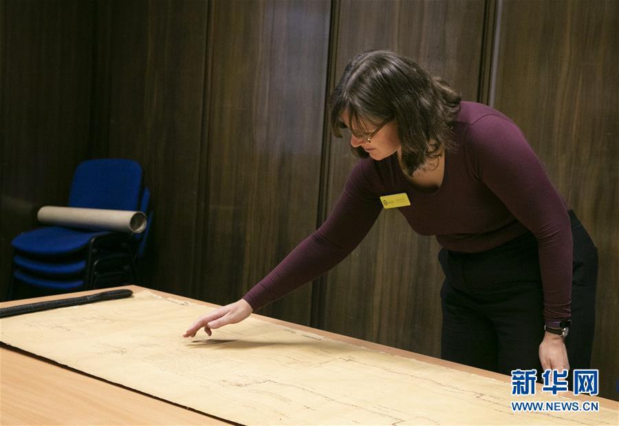 11月2日,在英國(guó)紐卡斯?fàn)柕奶┒鳌枡n案館,檔案管理員瑞秋·吉爾介紹致遠(yuǎn)艦設(shè)計(jì)圖紙。 新華社記者日前在紐卡斯?fàn)柼┒鳌枡n案館查找北洋海軍史料時(shí)發(fā)現(xiàn)一套七張、檔案名為“中國(guó)巡洋艦舵機(jī)設(shè)計(jì)圖”的原始圖紙。塵封百年,甲午海戰(zhàn)中抗擊日艦后沉沒(méi)的清北洋海軍致遠(yuǎn)艦部分原廠(chǎng)設(shè)計(jì)圖紙?jiān)谄浣ㄔ斓亍?guó)紐卡斯?fàn)柺械囊患覚n案館首次被發(fā)現(xiàn),為打撈那段悲壯的歷史提供了重要參考。 新華社記者 韓巖 攝