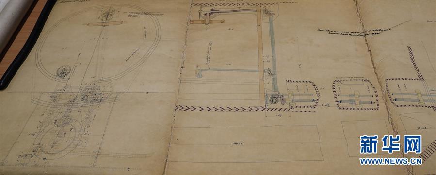這是11月2日,在英國(guó)紐卡斯?fàn)柵臄z的橫跨在泰恩河上的紅白兩色的鋼鐵旋轉(zhuǎn)橋泰恩橋。當(dāng)年,致遠(yuǎn)艦就是從這里駛向大海,開(kāi)啟東方征程。 新華社記者日前在紐卡斯?fàn)柼┒鳌枡n案館查找北洋海軍史料時(shí)發(fā)現(xiàn)一套七張、檔案名為“中國(guó)巡洋艦舵機(jī)設(shè)計(jì)圖”的原始圖紙。塵封百年,甲午海戰(zhàn)中抗擊日艦后沉沒(méi)的清北洋海軍致遠(yuǎn)艦部分原廠設(shè)計(jì)圖紙?jiān)谄浣ㄔ斓亍?guó)紐卡斯?fàn)柺械囊患覚n案館首次被發(fā)現(xiàn),為打撈那段悲壯的歷史提供了重要參考。 新華社記者 韓巖 攝