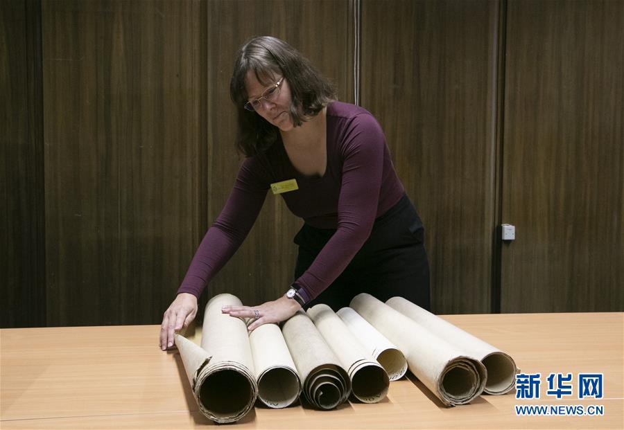 11月2日,在英國(guó)紐卡斯?fàn)柕奶┒鳌枡n案館,檔案管理員瑞秋·吉爾介紹致遠(yuǎn)艦設(shè)計(jì)圖紙。 新華社記者日前在紐卡斯?fàn)柼┒鳌枡n案館查找北洋海軍史料時(shí)發(fā)現(xiàn)一套七張、檔案名為“中國(guó)巡洋艦舵機(jī)設(shè)計(jì)圖”的原始圖紙。塵封百年,甲午海戰(zhàn)中抗擊日艦后沉沒(méi)的清北洋海軍致遠(yuǎn)艦部分原廠設(shè)計(jì)圖紙?jiān)谄浣ㄔ斓亍?guó)紐卡斯?fàn)柺械囊患覚n案館首次被發(fā)現(xiàn),為打撈那段悲壯的歷史提供了重要參考。 新華社記者 韓巖 攝