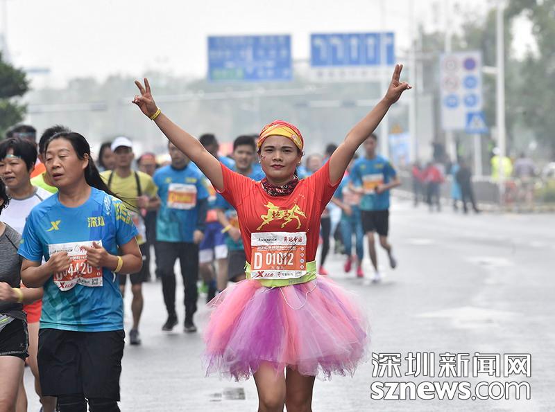 2018年12月16日,深圳國際馬拉松位于后海的折返點(diǎn),即將抵達(dá)終點(diǎn),一名選手?jǐn)[出勝利姿勢。