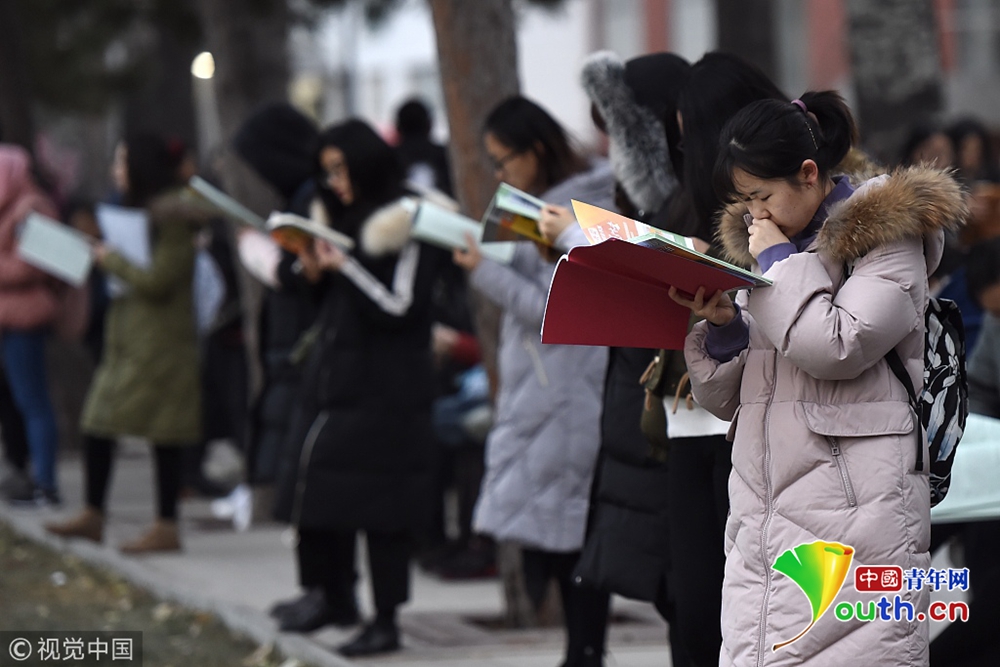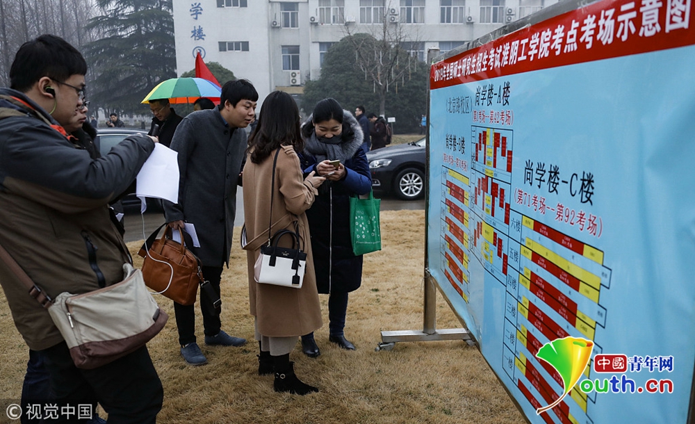 2018年12月22日,南京,在南京林業(yè)大學(xué)考點(diǎn),考生在雨中復(fù)習(xí),看考場分布圖,候考和進(jìn)場。