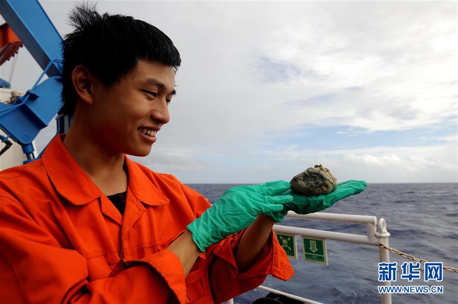 科考團隊成員林剛展示在泥火山采集到的蛇紋石樣品(12月20日攝)。