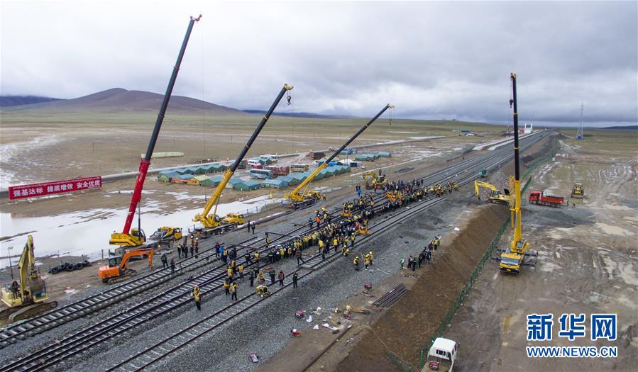 這是2017年7月26日無人機(jī)拍攝的青藏鐵路格爾木至拉薩段擴(kuò)能改造工程唐古拉車站撥接工作現(xiàn)場。 新華社記者 劉東君 攝