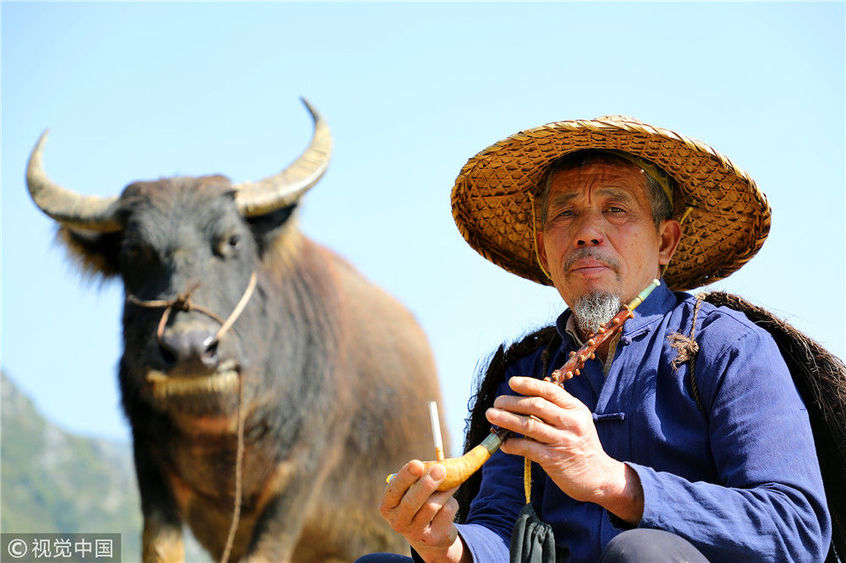 2018年12月17日,廣西桂林。用不到3年時間,農(nóng)民許修保愣是將自己家的水牛訓練得走上了貓步,這讓來自全國各地的游客嘖嘖稱奇:你這么牛,維密天使情何以堪?憑著與水牛的聯(lián)袂演出,一個月下來,老許會有兩三萬的收入進賬,佩服得左鄰右舍紛紛向他伸出了大拇指。棋簿紫/視覺中國