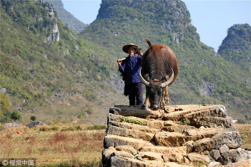 12月17日,在廣西桂林的臨桂區(qū)田心村這座叫做狀元橋的小橋上,剛吃過午飯,老許和他的水牛搭檔又要開始一場生態(tài)演出了。