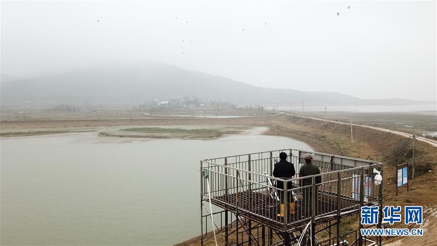 12月22日,王三益(左)在菜子湖濕地觀測候鳥(無人機拍攝)。 新華社記者 張端 攝