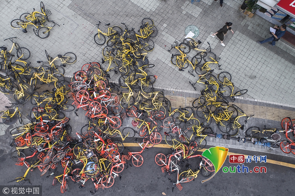 2018年10月24日,廣東東莞,堆積的共享單車。