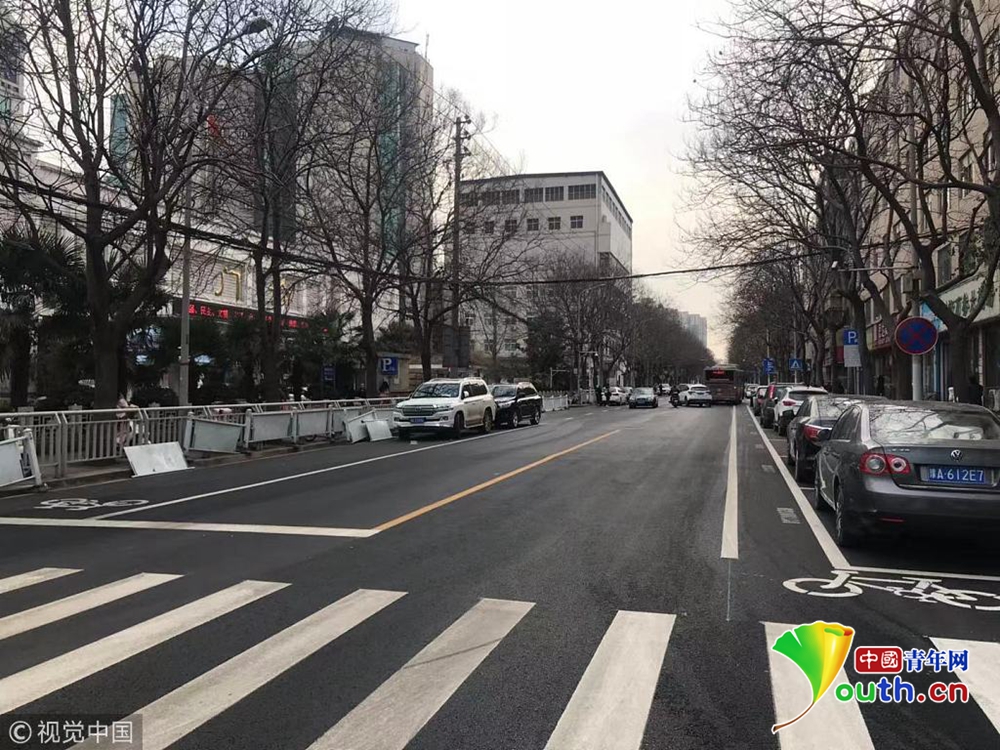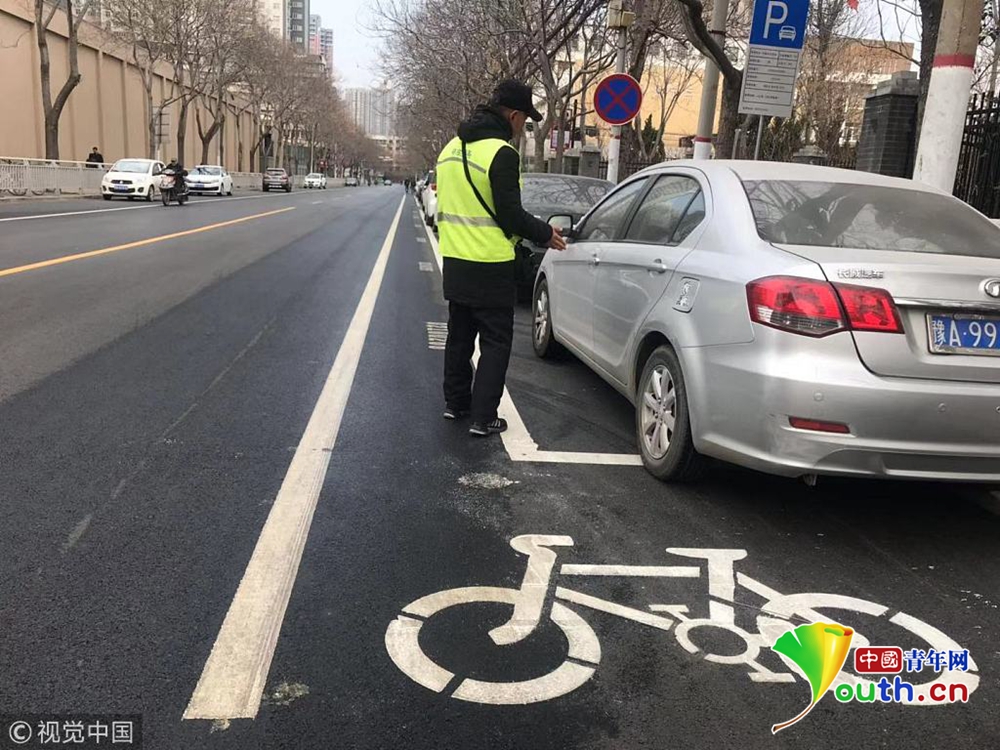 現(xiàn)場,文化宮路與友愛路口附近,新鋪好的路面被劃上了嶄新的行車線和停車位標(biāo)線。從文化宮路和友愛路交叉口向北,道路東側(cè)的非機(jī)動車道被停車位占去后,僅剩下0.8米左右的寬度。同樣在路口南側(cè),道路西側(cè)的非機(jī)動車道也被新劃的停車位占去,僅剩不足1米的寬度。