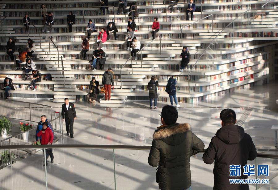 12月27日,讀者在天津?yàn)I海新區(qū)圖書館的“書山”上參觀。 濱海新區(qū)圖書館位于天津?yàn)I海文化中心,2017年10月1日正式開館,設(shè)計(jì)立意為“濱海之眼”和“書山有路勤為徑”。圖書館現(xiàn)有藏書60多萬冊(cè),一年多來接待讀者約280萬人次,已成為濱海新區(qū)的文化“新地標(biāo)”。 新華社記者段卓力攝