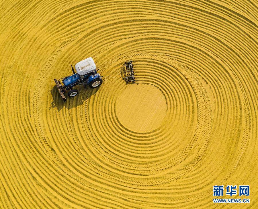 10月23日,在位于江蘇泗洪的洪澤湖農(nóng)場,一臺農(nóng)機(jī)在翻曬稻谷。