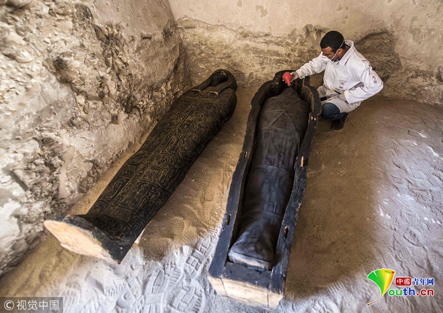 當(dāng)?shù)貢r(shí)間2018年11月24日,埃及盧克索,考古學(xué)家在當(dāng)?shù)匕l(fā)掘出一處墓穴,在其中發(fā)現(xiàn)石棺、木乃伊等文物,時(shí)間可追溯至公元前4-7世紀(jì)。圖片來源:視覺中國