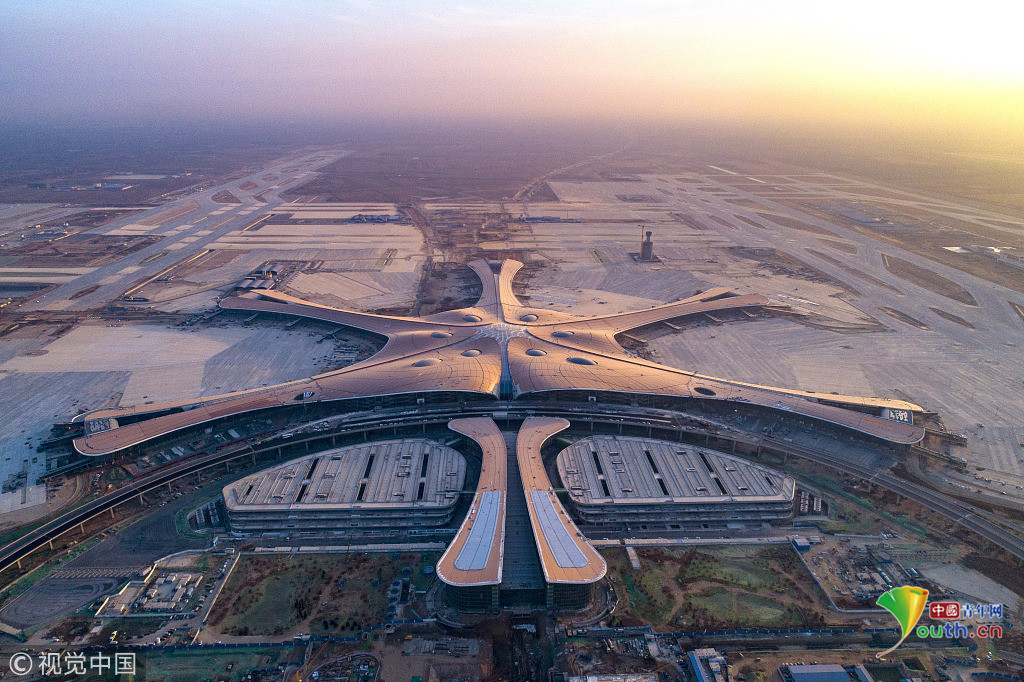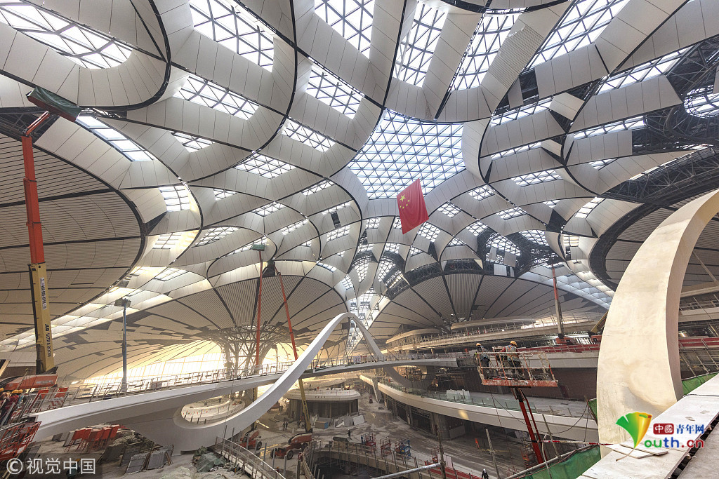 中國青年網(wǎng)北京12月20日電 2018年12月19日,北京大興國際機場航站樓的屋面已基本完工,一只金色“鳳凰”完整地出現(xiàn)在北京城南。航站樓的室內(nèi)裝修在有條不紊的推進中。