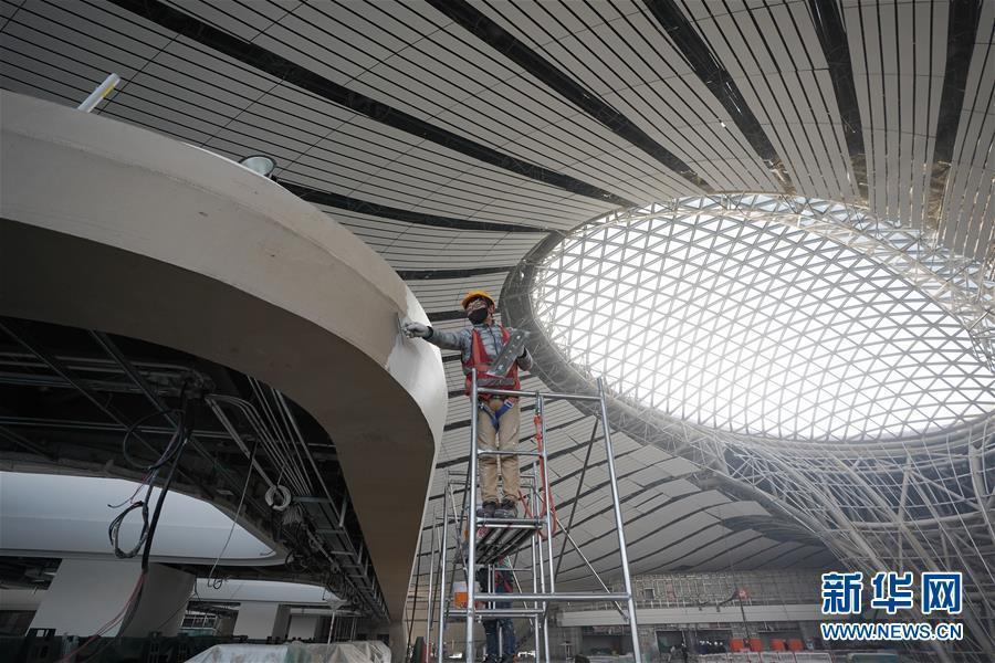 在北京大興國際機場主航站樓內(nèi),施工人員在進行裝飾裝修工作。新華社記者 鞠煥宗 攝 圖片來源:新華網(wǎng)
