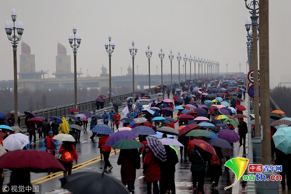 2018年12月26日,南京。南京長江大橋維修改造工程竣工通車在即,12月26日至28日三天向公眾開放,12月26日,“市民開放日”首日,早晨九時許,雖然下著雨,但記者在南京長江大橋入口和橋上看到,如織的市民打著傘來到大橋,整個橋上全是撐傘觀看的市民,足有萬人,十分壯觀。