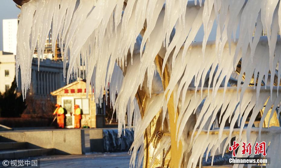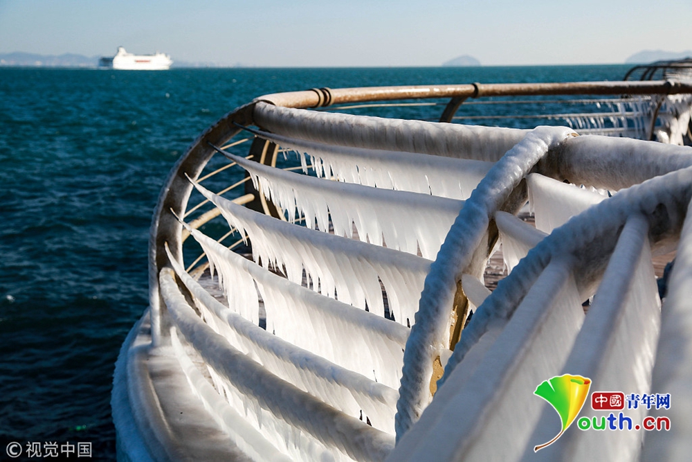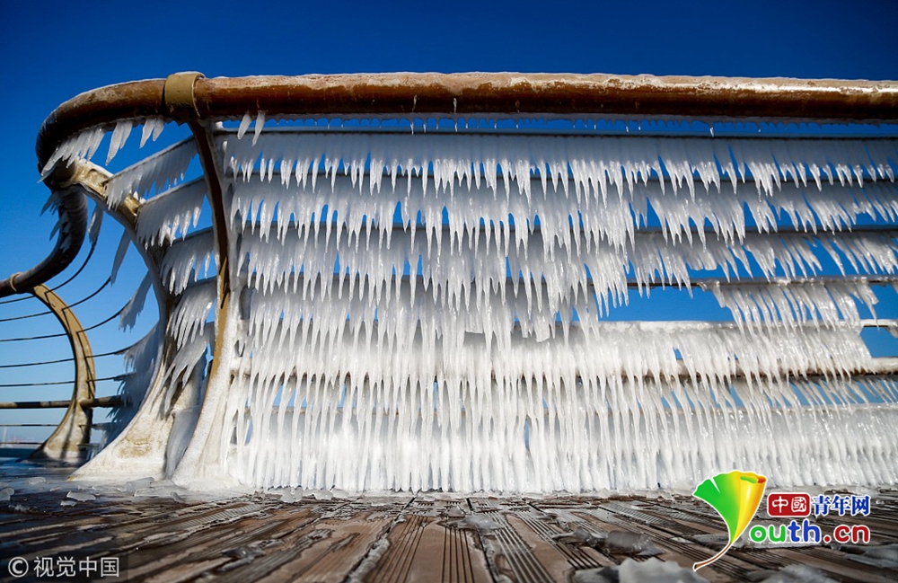 渤海海水在北風(fēng)的作用下涌向岸邊,在大連東港海岸護(hù)欄上凝結(jié)成冰凌,形成約有兩公里的冰凌奇觀。圖為大連市東港海岸護(hù)欄結(jié)滿晶瑩剔透的冰棱。圖片來(lái)源:視覺(jué)中國(guó)
