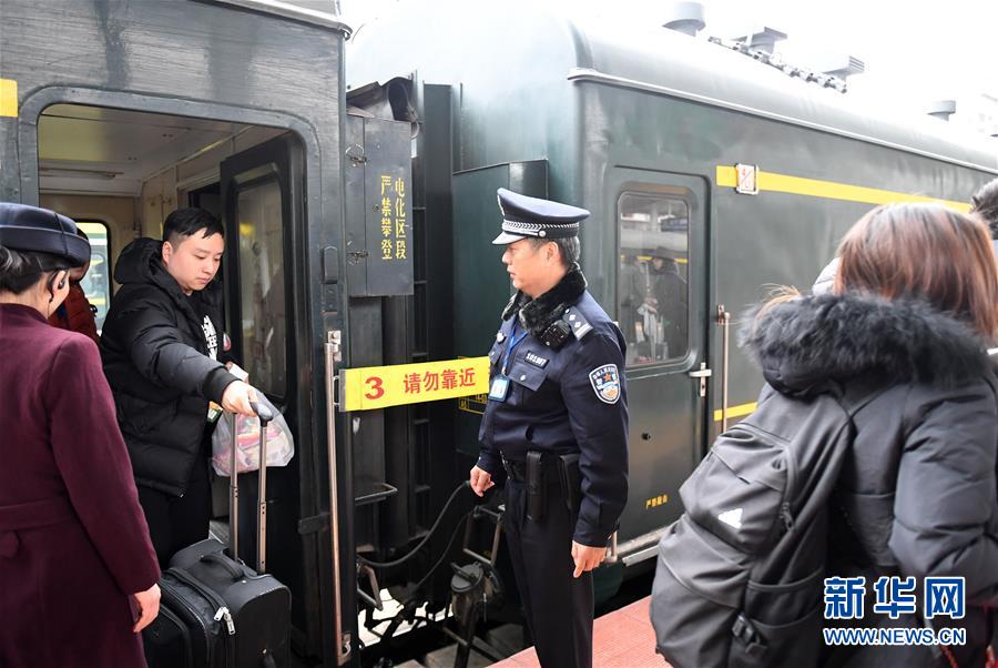 1月1日,在廣西南寧火車站,乘警楊鐵鳴在從越南河內(nèi)(嘉林)開往中國南寧列車旁值勤。 新華社記者陸波岸攝
