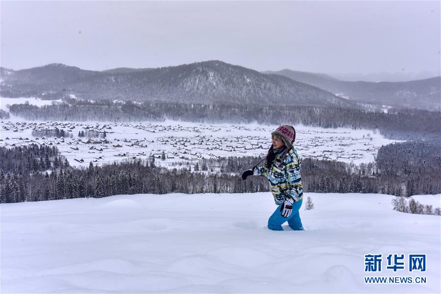 1月1日,在新疆禾木雪鄉(xiāng),當?shù)鼐用癖硌荨把┑毓媚镒贰薄?/p>