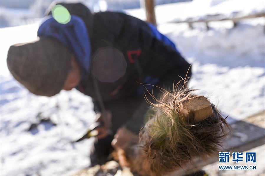 森格爾在新疆布爾津縣禾木村的一處冬季牧場制作毛皮滑雪板(1月3日攝)。 新華社記者 胡虎虎 攝
