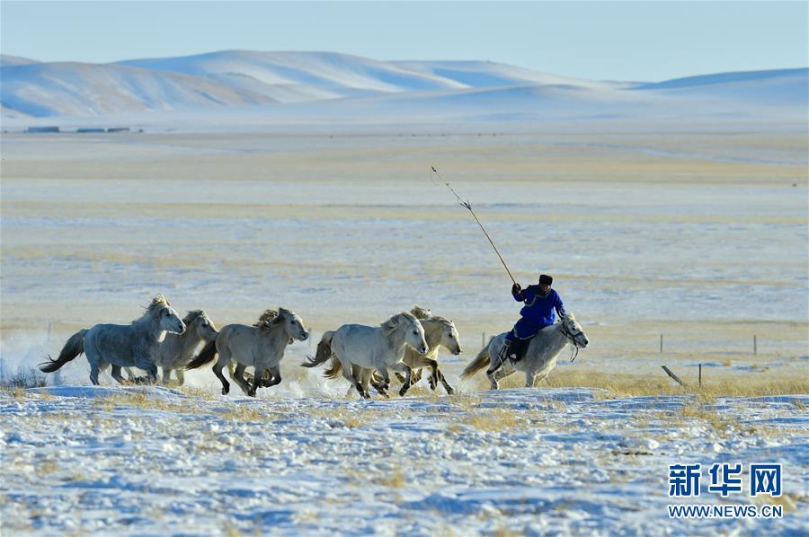 1月8日,牧民進(jìn)行套馬表演。 時(shí)下正值草原冬季旅游旺季,內(nèi)蒙古自治區(qū)西烏珠穆沁旗的牧民們?cè)谘┰弦徽股硎郑瑸橛慰驼宫F(xiàn)獨(dú)特的民族風(fēng)情。 新華社記者 鄒予 攝