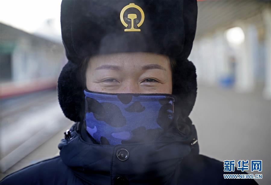 1月11日,在滿洲里火車站站臺,由于氣溫近零下30攝氏度,“金鑰匙”服務(wù)臺客運員“呵氣成霧”。